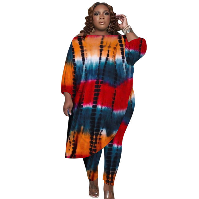 Plus Size Tie Dye Printing Loose Shoulder Top Pant Two Piece Set