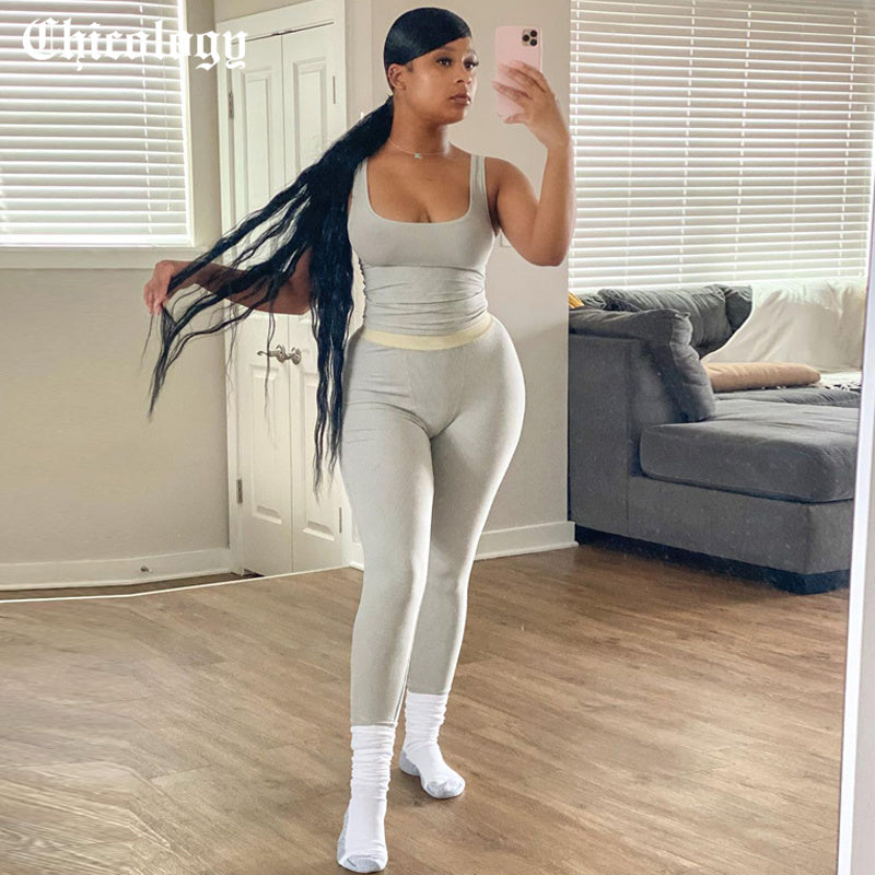 Women Sleeveless Stretchy Crop Tank Top Solid Color 2 Two Piece Sets