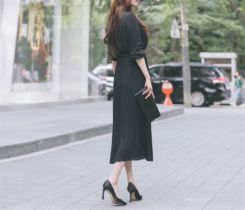Elegant Women Pleated Long Sleeve Slim Waist A-line Dress