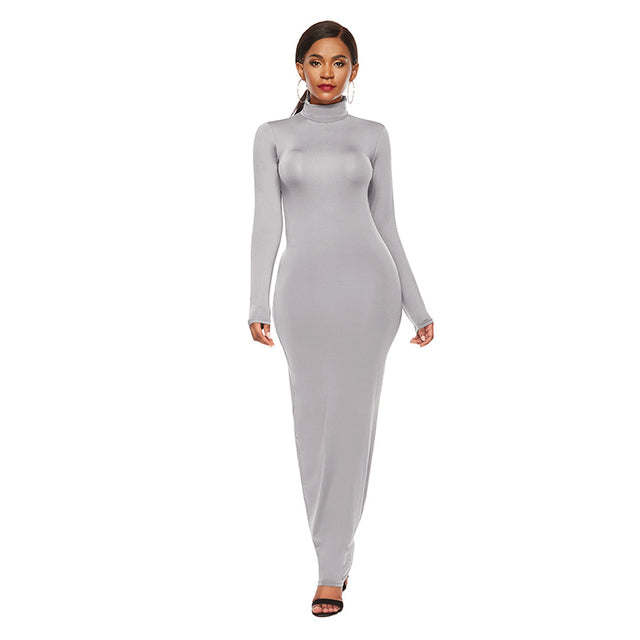 Women Turtleneck Long Sleeve Maxi Solid Color Dress
