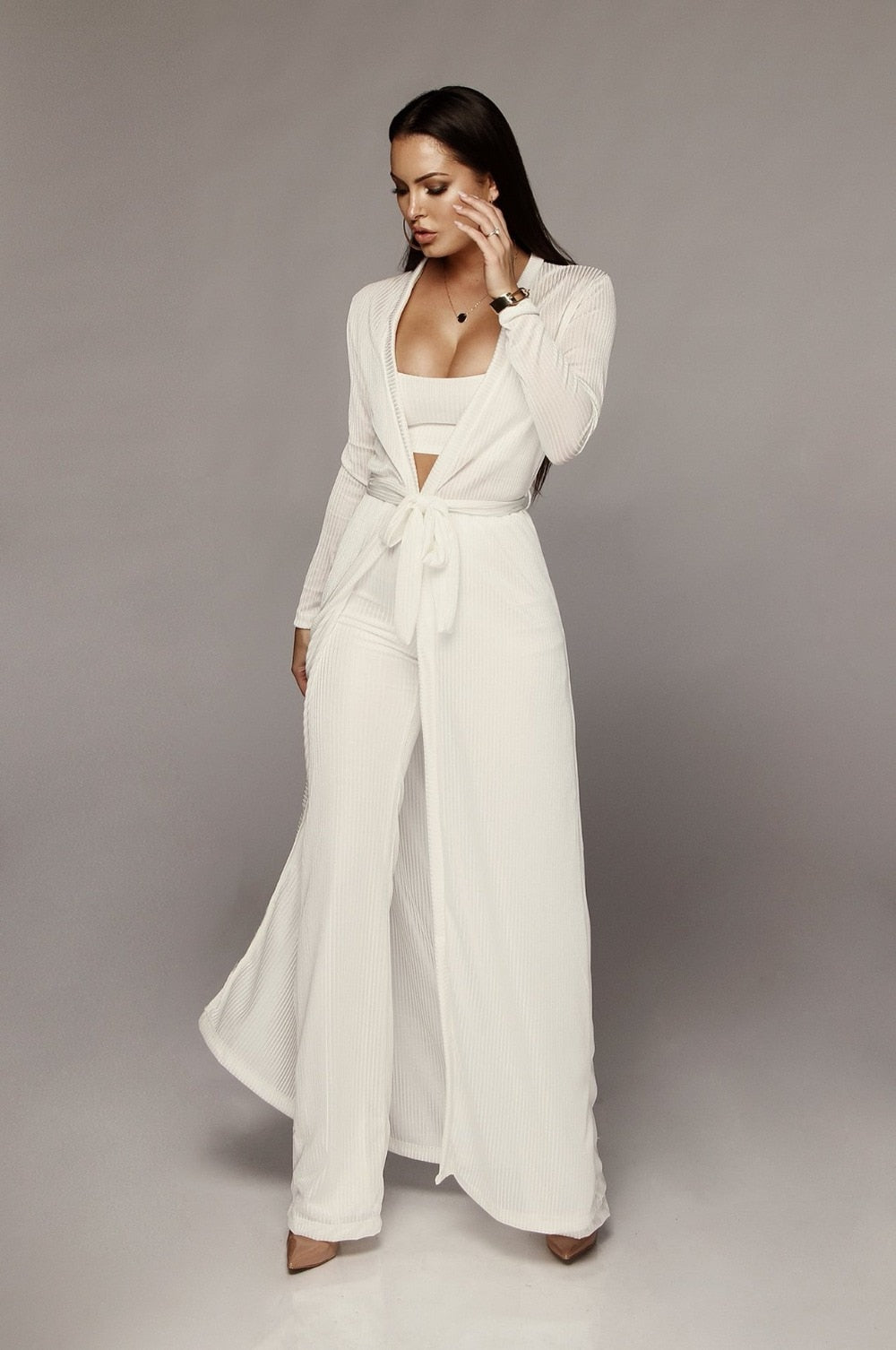 Women Bandage Long Sleeve Cardigan Loose Wide Leg 3 Piece Pant Set