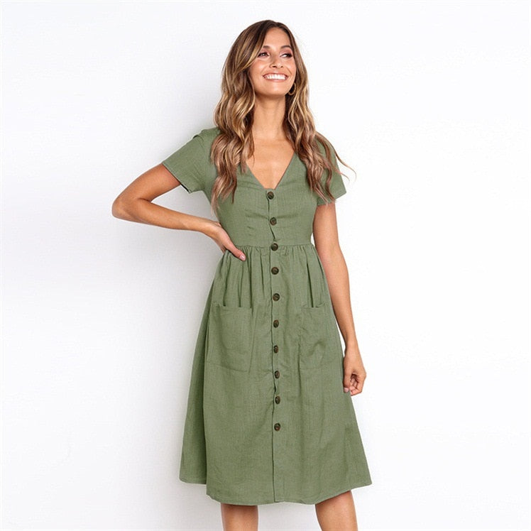 Women Boho Summer Cotton Linen Vintage Beach V Neck Dress