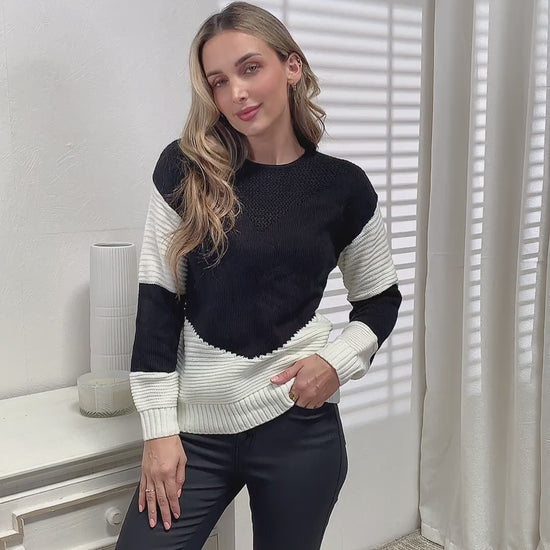 Our two-tone rib-knit sweater is the perfect layering piece for any outfit. Its openwork design and classic round neckline add a feminine touch to this staple item, while its long sleeves and sturdy knit body keep you cozy no matter the season.
