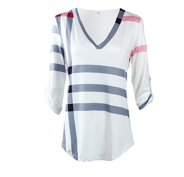 Women's Casual 2/3 Sleeve V-Neck Plaid Shirts Pullover Top